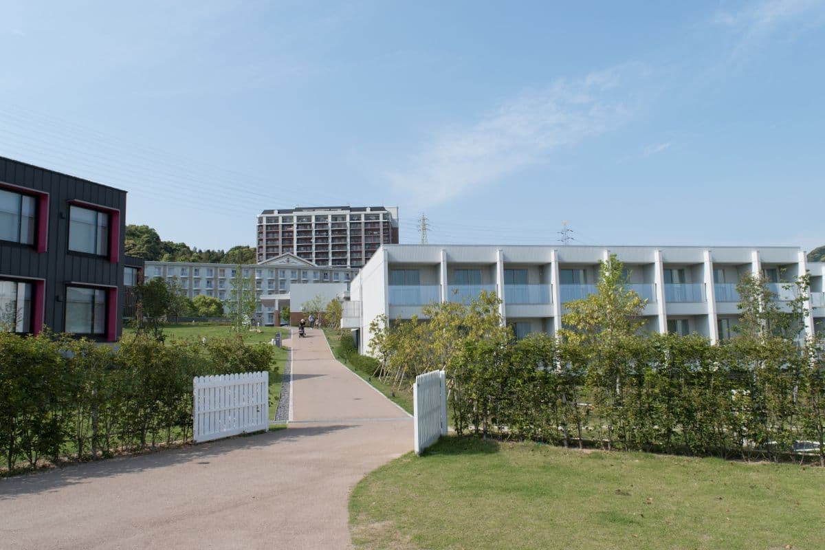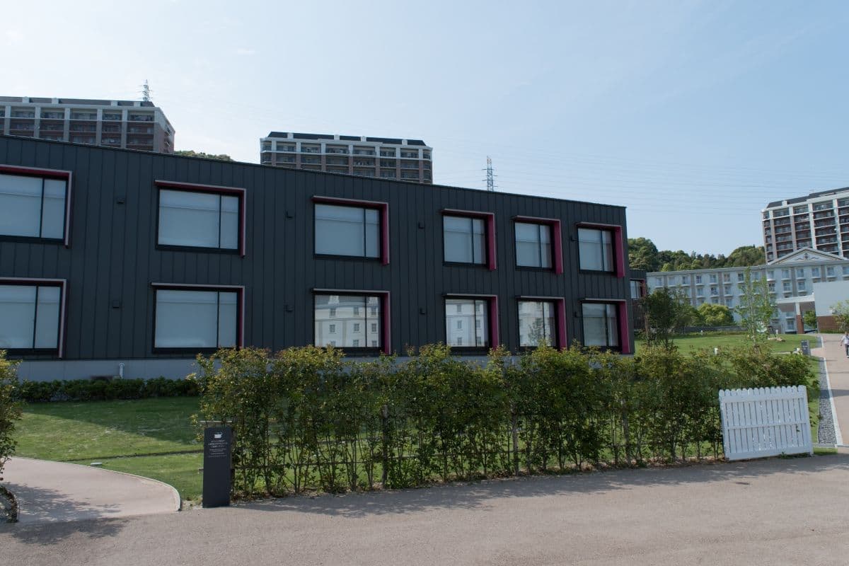 赤い建物はウェストアーム イーストアームは変なホテルがオープンした時からあり、ウェストアームは今年の2016-03-15にオープンしたばっかりの建物です。 自分たちが泊まる予定なのはイーストアームの白い建物です。