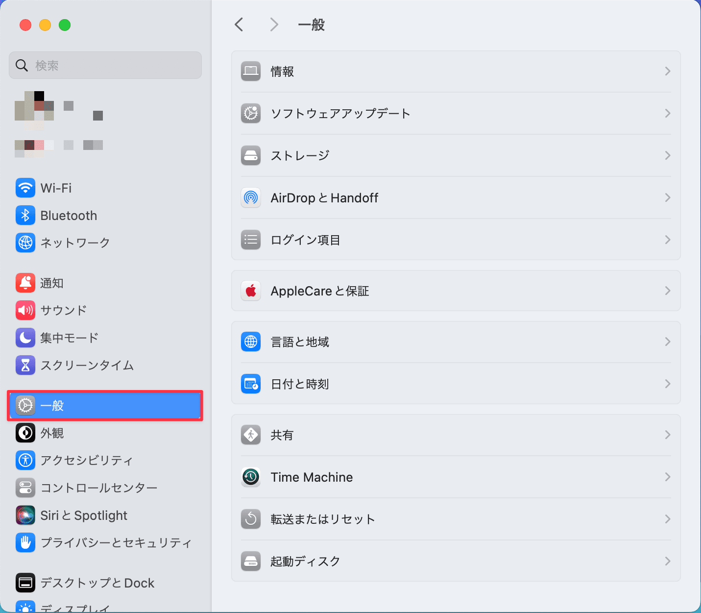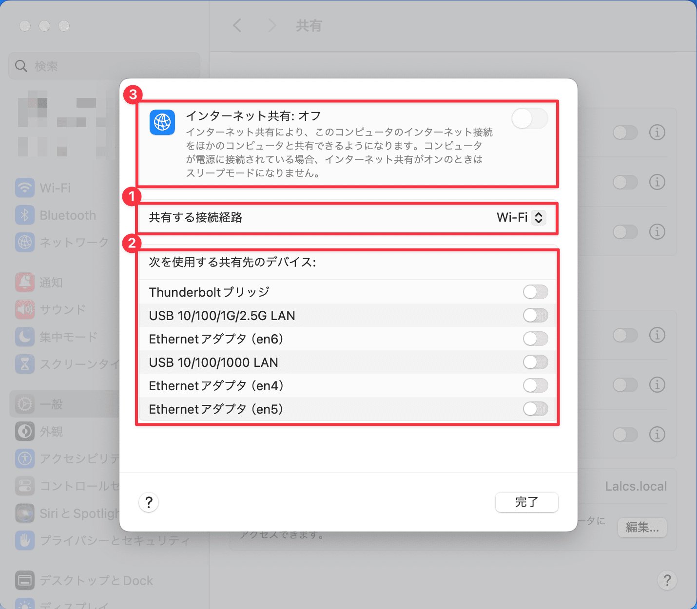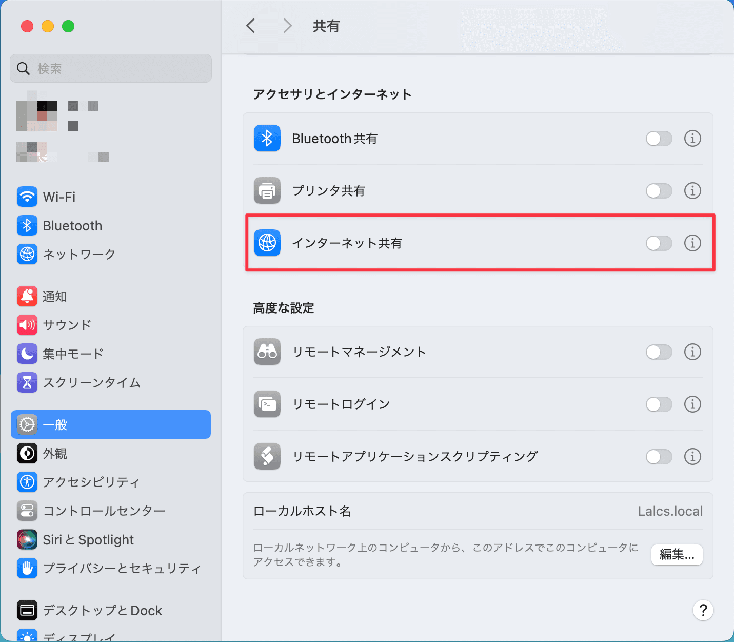 1. システム設定、一般、共有を開く