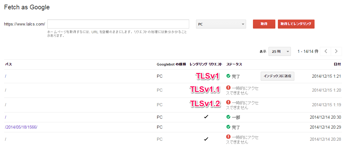 どうやらGoogleBotはTLSv1以下で通信処理をしているらしくそれ以降のプロトコルではサイトを読み取ることができませんでした。